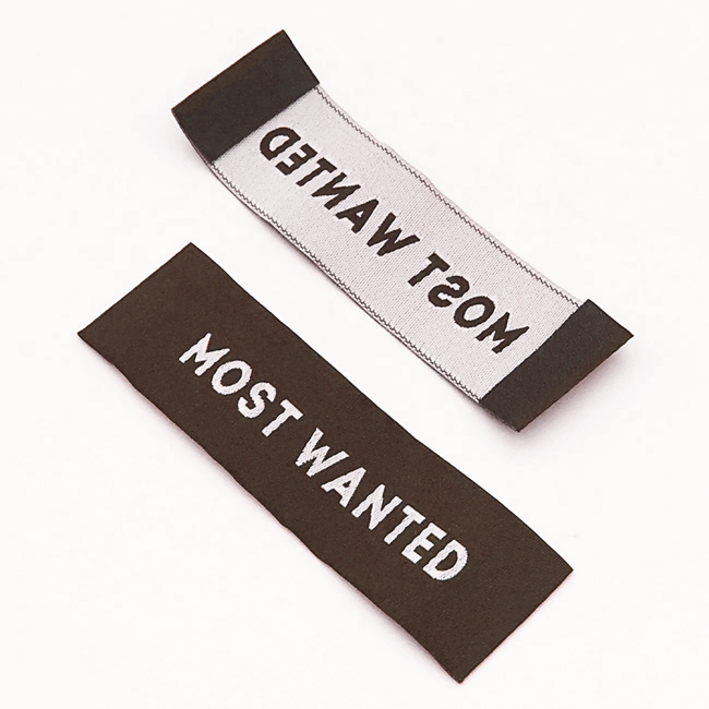Szövött címke különféle ruházathoz vagy egyéb textíliákhoz, damasztból, hajlított szélekkel. Ez a textil címke modell kiváló minőségű anyagokból készül, a legmagasabb technológiákat használva a digitális hímzés területén ipari szinten.