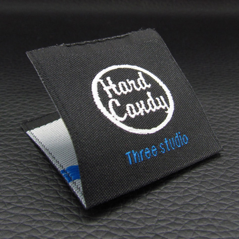 Félbehajtott Scarce Style textil címke, különféle ruhák és textil termékek számára, a brand nevével, emblémájával illetve ápolási utasításokkal és összetétellel személyre szabva. Ez a textil címke modell kiváló minőségű anyagokból készül, a legmagasabb technológiákat használva a digitális hímzés területén ipari szinten.