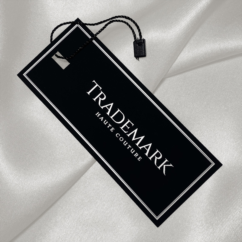 Ruházat vagy különböző típusú ruhák és cipők címkéje, laminált kartonból Soft Touch fóliával, és ezüst fóliával személyre szabva. Ez a címkemodell kiváló minőségű anyagokból készül, a legfejlettebb technológiák felhasználásával a digitális nyomtatás és a kidolgozás területén.