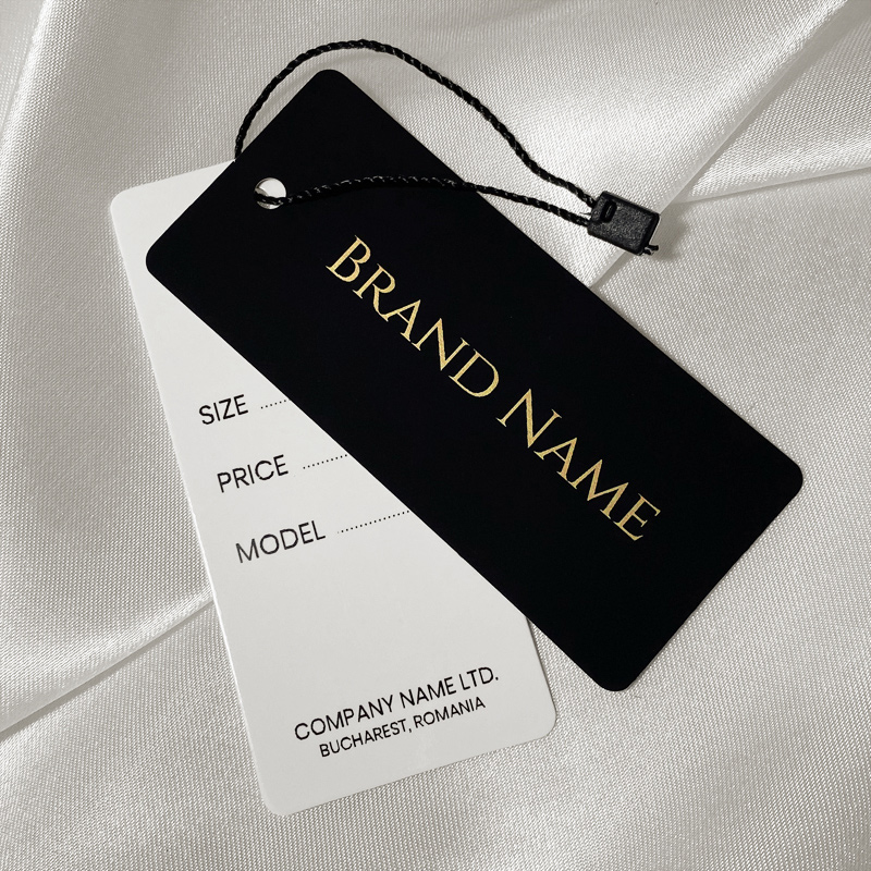 2 karton címke készlet, a plombák húzózsinórral ruhákra vagy ruházati kiegészítőkre akasztásra, vastag laminált karton készült és fekete szöveggel nyomtatva. Ez a címkemodell kiváló minőségű anyagokból készül, a legfejlettebb technológiák felhasználásával a digitális nyomtatás és a kidolgozás területén.