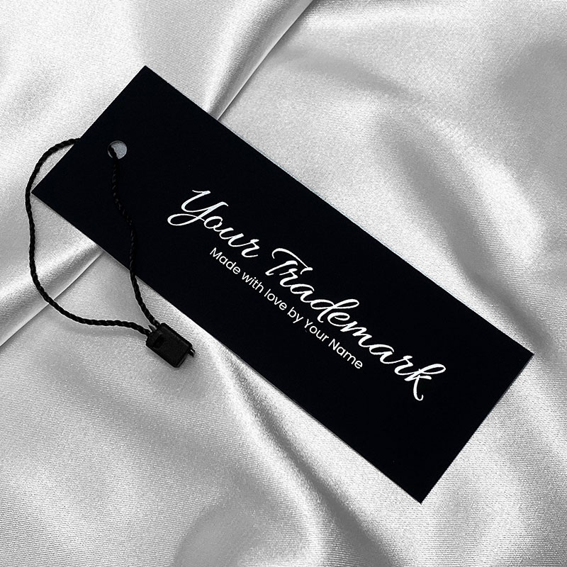 Személyre szabott címke fekete kartonból, ezüst mintával, egyszerű, de nagyon elegáns kialakítással ruházathoz, cipőhöz vagy különféle ruházati kiegészítőkhöz. Ez a címkemodell kiváló minőségű anyagokból készül, a legfejlettebb technológiák felhasználásával a digitális nyomtatás és a kidolgozás területén.