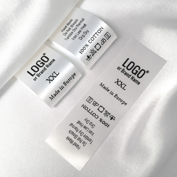 Mosási címke a finom szaténra nyomtatva a méretjelzővel, valamint karbantartási és mosási adatok, különféle ruha- és textiltermékekhez használható. Ezt a textilcímke-modellt a textilhordozókra való digitális nyomtatás területén a legfejlettebb technológiák felhasználásával gyártják. A címkéket speciális szaténra nyomtatják hőátadási módszerrel, lenyűgöző nyomtatási minőséggel és nagy mosóképességgel. A nyomtatott címkék automatikusan levágásra kerülnek a bemutatott méretek szerint.