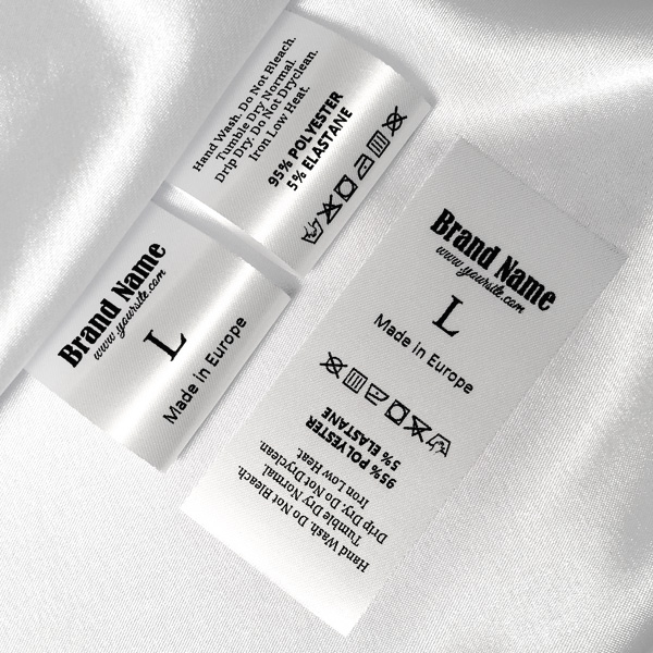 Mosási címke szaténből készül, amely méretinformációkat tartalmaz, mosási és karbantartási szövegek és táblák, hanem a márkanév is, ruházatra alkalmas. Ezt a textilcímke-modellt a textilhordozókra való digitális nyomtatás területén a legfejlettebb technológiák felhasználásával gyártják. A címkéket speciális szaténra nyomtatják hőátadási módszerrel, lenyűgöző nyomtatási minőséggel és nagy mosóképességgel. A nyomtatott címkék automatikusan levágásra kerülnek a bemutatott méretek szerint.