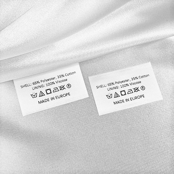 Textil címke mosási és ápolási szimbólumokkal, valamint információ az anyag összetételéről, finom, kiváló minőségű szaténra, ultrahangosan forró vágásra szabva. Ezt a textilcímke-modellt a textilhordozókra való digitális nyomtatás területén a legfejlettebb technológiák felhasználásával gyártják. A címkéket speciális szaténra nyomtatják hőátadási módszerrel, lenyűgöző nyomtatási minőséggel és nagy mosóképességgel. A nyomtatott címkék automatikusan levágásra kerülnek a bemutatott méretek szerint.