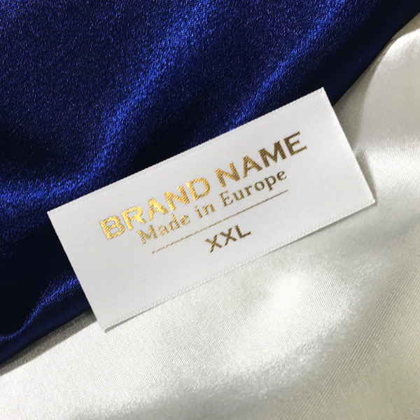 Textilcímke nyomtatva egyedi szövegekkel és méretjelző, ruházathoz és ruházati kiegészítőkhöz alkalmas. Ezt a textilcímke-modellt a textilhordozókra való digitális nyomtatás területén a legfejlettebb technológiák felhasználásával gyártják. A címkéket speciális szaténra nyomtatják hőátadási módszerrel, lenyűgöző nyomtatási minőséggel és nagy mosóképességgel. A nyomtatott címkék automatikusan levágásra kerülnek a bemutatott méretek szerint.