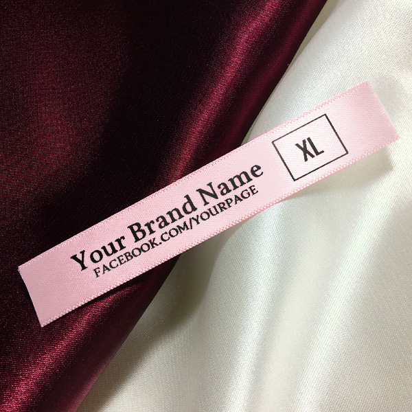Textilcímke a márkanév és méretmutatóval,, finom szaténból készült különböző színekben nyomtatva, ruházatra alkalmas. Ezt a textilcímke-modellt a textilhordozókra való digitális nyomtatás területén a legfejlettebb technológiák felhasználásával gyártják. A címkéket speciális szaténra nyomtatják hőátadási módszerrel, lenyűgöző nyomtatási minőséggel és nagy mosóképességgel. A nyomtatott címkék automatikusan levágásra kerülnek a bemutatott méretek szerint.