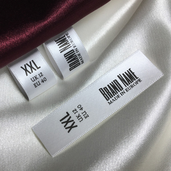 Címke a méret szaténra nyomtatva, személyre szabva a hátul Márkanévvel vagy Logóval, ruházatra alkalmas. Ezt a textilcímke-modellt a textilhordozókra való digitális nyomtatás területén a legfejlettebb technológiák felhasználásával gyártják. A címkéket speciális szaténra nyomtatják hőátadási módszerrel, lenyűgöző nyomtatási minőséggel és nagy mosóképességgel. A nyomtatott címkék automatikusan levágásra kerülnek a bemutatott méretek szerint.