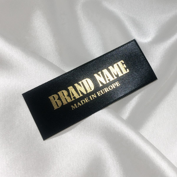 Textilcímke Márkanévvel nyomtatott arany írással egy fekete színű finom szaténon, ruházatra alkalmas. Ezt a textilcímke-modellt a textilhordozókra való digitális nyomtatás területén a legfejlettebb technológiák felhasználásával gyártják. A címkéket speciális szaténra nyomtatják hőátadási módszerrel, lenyűgöző nyomtatási minőséggel és nagy mosóképességgel. A nyomtatott címkék automatikusan levágásra kerülnek a bemutatott méretek szerint.